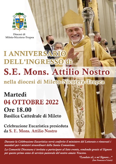 E’ in programma martedì 4 ottobre, la Celebrazione Eucaristica in occasione del primo anniversario dell’ordinazione episcopale e dell’ingresso in diocesi di S. Ecc. Mons. Attilio Nostro.