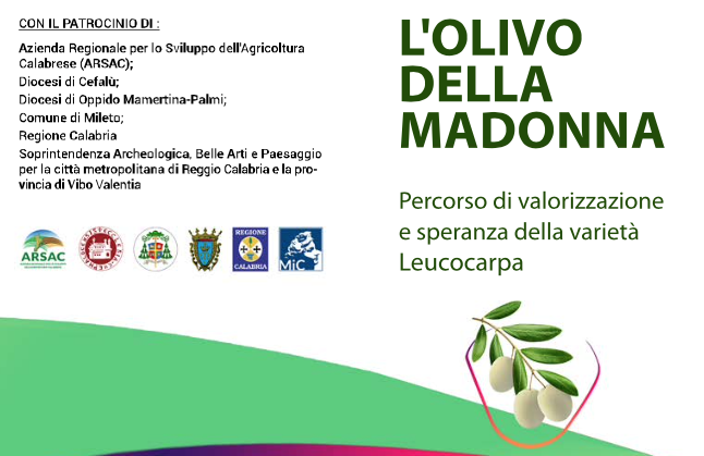Si svolgerà sabato 23 novembre 2024, a Mileto (VV) nella sala conferenze del Palazzo San Giuseppe il II Convegno nazionale di Archeoclub d’Italia dal titolo L’olivo della Madonna: percorso di valorizzazione e speranza della varietà Leucocarpa voluto da Archeoclub d’Italia e dal suo presidente Rosario Santanastasio e organizzato dalla sede di Vibo Valentia di Archeoclub d’Italia con il concreto sostegno di S.E.R. Mons. Attilio Nostro, Vescovo di Mileto e Delegato CEC per Il Servizio di Pastorale Giovanile. All’iniziativa hanno dato il patrocinio l’ARSAC Azienda Regionale per lo Sviluppo dell’Agricoltura Calabrese; il Comune di Mileto; le diocesi di Cefalù e Oppido Mamertina-Palmi, la Soprintendenza Archeologia, Belle Arti e Paesaggio per la città metropolitana di Reggio Calabria e la provincia di Vibo Valentia e la Regione Calabria.