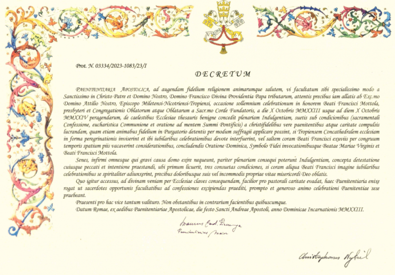 LA PENITENZERIA APOSTOLICA, per accrescere la pietà dei fedeli e la salvezza delle anime, vista la richiesta inoltrata dall’eccellentissimo mons. Attilio Nostro, vescovo di Mileto – Nicotera- Tropea in occasione delle solenni celebrazioni in onore del beato Francesco Mottola, sacerdote e fondatore degli Oblati e delle Oblate del Sacro Cuore, che si svolgeranno dal 10 ottobre 2023 al 10 ottobre 2024, in forza delle facoltà ad essa conferite in modo specialissimo dal Santo Padre Francesco, concede volentieri l’indulgenza plenaria, alle consuete condizioni (Confessione, Comunione e preghiera secondo le intenzioni del Romano Pontefice), applicabile a modo di suffragio anche alle anime del Purgatorio, a tutti i fedeli che, davvero pentiti e spinti dalla carità, si recheranno in pellegrinaggio alla concattedrale di Tropea e parteciperanno devotamente alle celebrazioni giubilari o almeno si tratterranno per congruo tempo in pia meditazione davanti alle spoglie del Beato Francesco concludendo con la Preghiera del Signore, il Simbolo della fede e delle invocazioni alla Beata vergine Maria e al Beato Francesco Mottola.