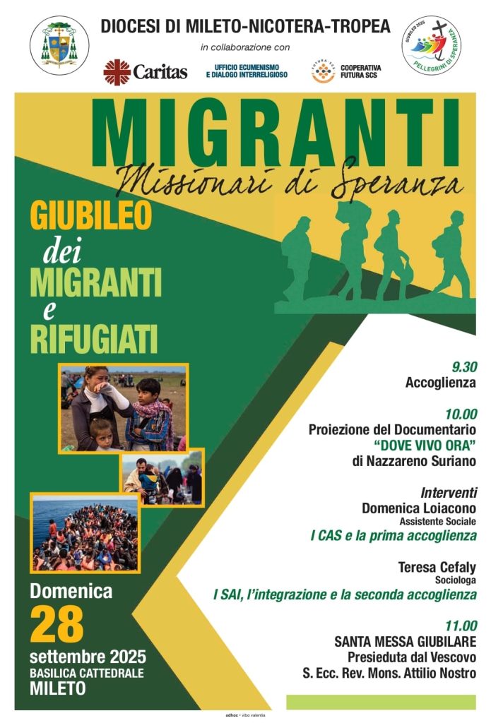 Nella mattinata di domenica 28 settembre, sempre a Mileto, in concomitanza con la Giornata Mondiale del Migrante e del Rifugiato, che si tiene regolarmente l’ultima domenica di settembre, si celebrerà, invece, il Giubileo diocesano del Migrante e del Rifugiato.