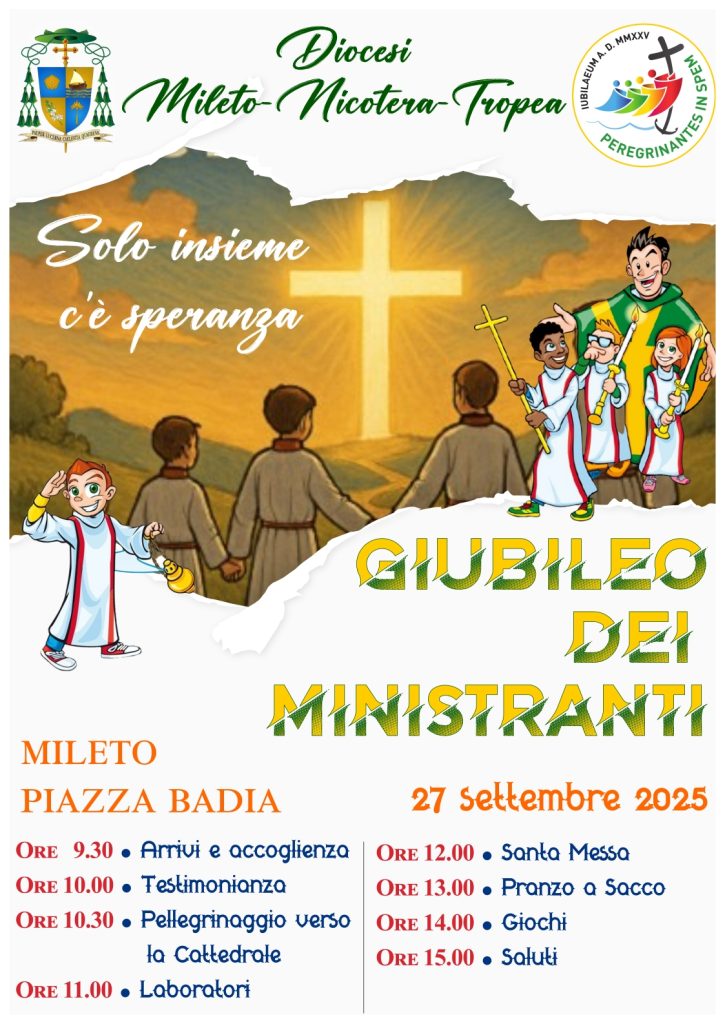 Si ricomincerà sabato 27 settembre con la celebrazione del Giubileo diocesano dei ministranti. L’evento, originariamente previsto per il 26 aprile e posticipato in seguito alla scomparsa di Papa Francesco, si svolgerà a Mileto con la partecipazione di tutti coloro che prestano servizio nelle varie parrocchie della Diocesi.