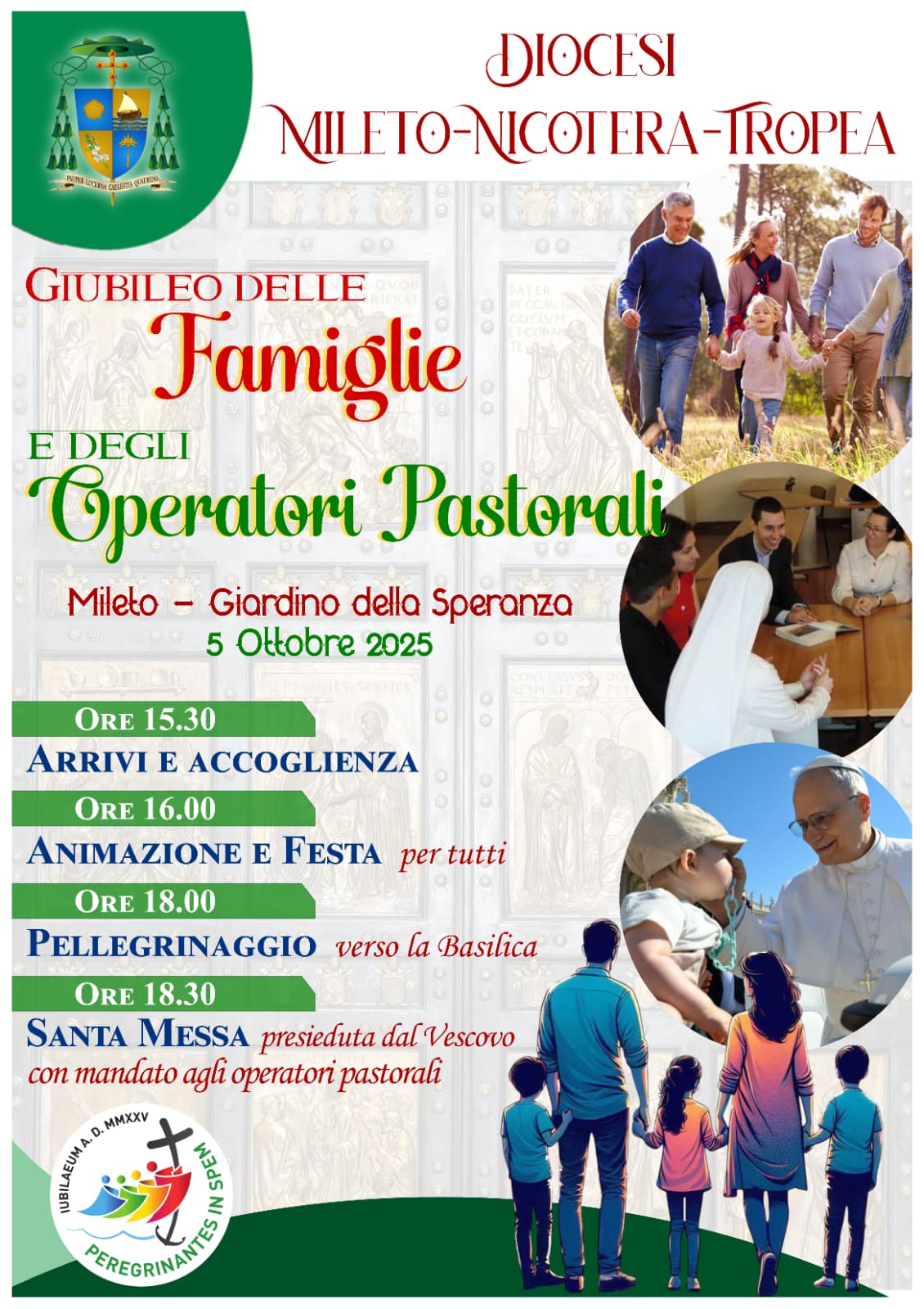 Nel pomeriggio di domenica 5 ottobre si celebreranno, invece, il Giubileo diocesano delle famiglie e il Giubileo diocesano degli operatori pastorali. Quest’ultimo, originariamente previsto per il 25 ottobre, data tradizionale dell’inizio dell’anno pastorale, è stato anticipato per la concomitanza dell’Assemblea Sinodale in programma a Roma. Nel corso della celebrazione eucaristica presieduta dal vescovo, S. Ecc. Mons. Attilio Nostro, sarà dato il mandato a tutti gli operatori pastorali.