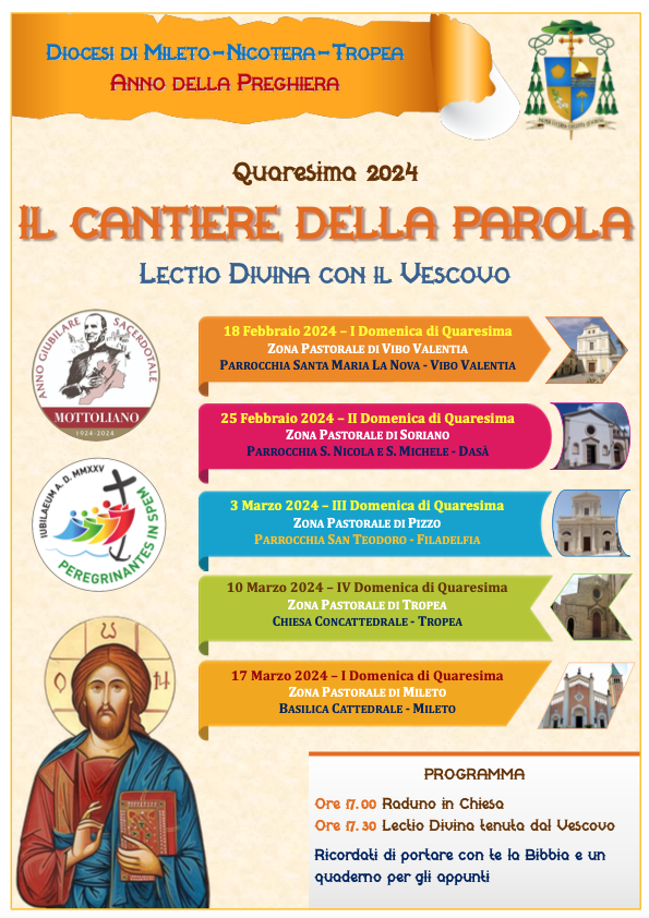 Il ciclo delle lectio divine inizierà domenica 18 Febbraio 2024 (I Domenica di Quaresima) nella Parrocchia di Santa Maria la Nova in Vibo Valentia per la zona pastorale di Vibo valentia. Sarà poi la volta della zona pastorale di Soriano che si ritroverà domenica 25 Febbraio 2024 (II Domenica di quaresima) presso la parrocchia di San Nicola e San Michele in Dasà.