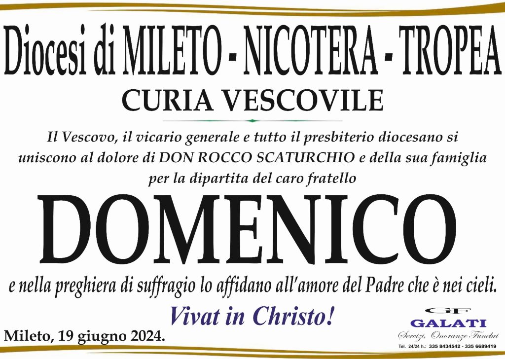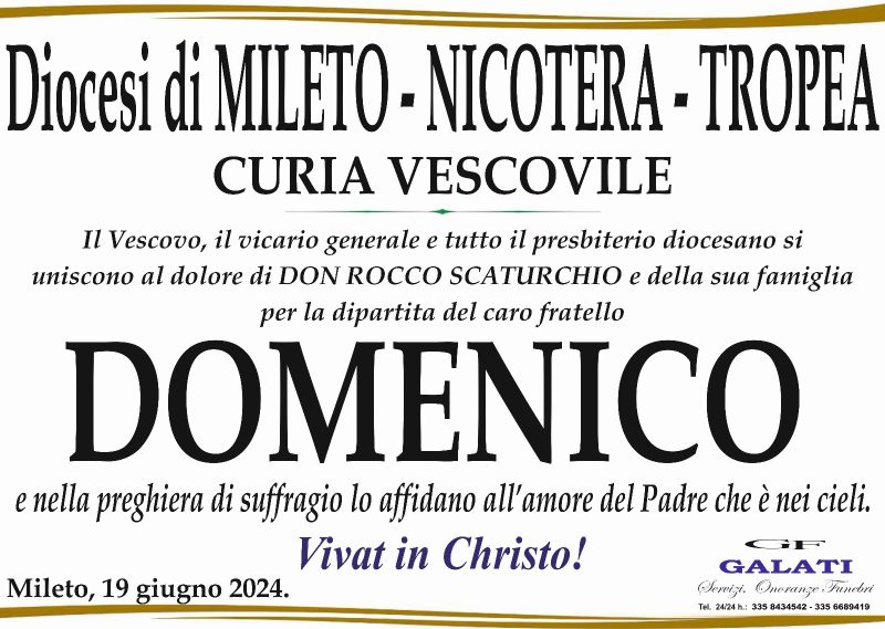 Il Vescovo, il vicario generale e tutto il presbiterio diocesano di uniscono al dolore di don Rocco Scaturchio, parroco della Parrocchia Maria Santissima Immacolata in San Calogero, per la dipartita del fratello Domenico, e nelle preghiere di suffragio lo affidano all’amore del Padre che è nei cieli.