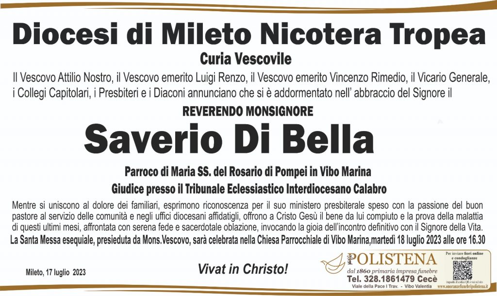 Mons. Saverio Di Bella si è addormentato nel Signore il 17 luglio 2023, all’età di 57 anni, presso l’Ospedale Civile di Vibo Valentia, dove era ricoverato in seguito ad una grave complicazione. Era nato a Parghelia (VV) il 11 febbraio 1966, da Francesco ed Eleonora Meligrana.