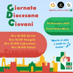 Eventi in Diocesi 19 Novembre 2022 Giornata Diocesana dei Giovani domenica 20 Novembre Descrizione: Inizio: 20/11/2022 16:00 Fine: 20/11/2022 18:00 Categorie: Eventi in Diocesi Organizzatore: Ufficio di pastorale giovanile Regione: Calabria Paese: Italia