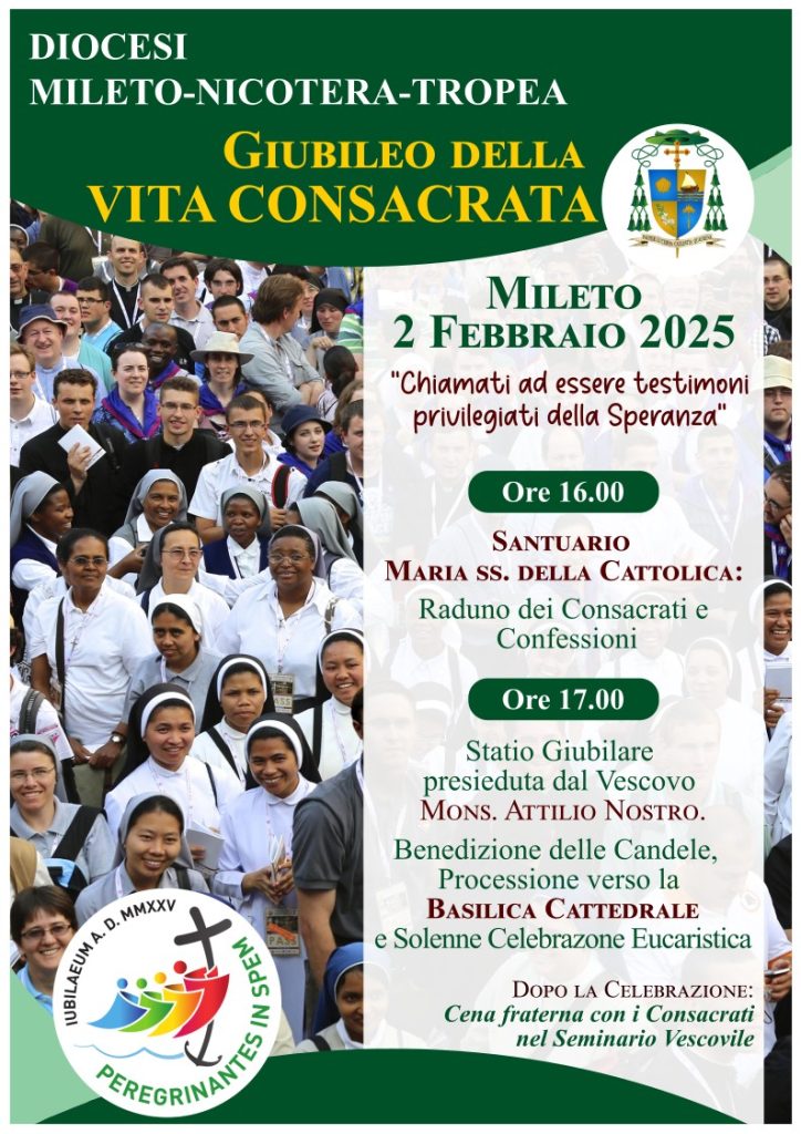 Eventi in Diocesi, Giubileo 13 Gennaio 2025 Giubileo della Vita Consacrata domenica 2 Febbraio Descrizione: Data: 02/02/2025 ore 17.00 - Mileto - Basilica Cattedrale Categorie: Eventi in Diocesi, Giubileo Indirizzo: Basilica Cattedrale di Mileto Regione: Calabria Paese: Italia giubileovitaconsacrata