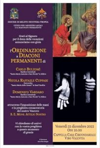 Eventi in Diocesi 12 Dicembre 2022 Ordinazione Diaconi permanenti venerdì 23 Dicembre Descrizione: Inizio: 23/12/2022 10:00 Fine: 23/12/2022 12:00 Categorie: Eventi in Diocesi Regione: Calabria Paese: Italia