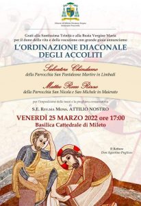 Nella solennità dell’Annunciazione saranno ordinati diaconi Matteo Rizzo, della comunità di Maierato, e Salvatore Chindamo, della comunità di Limbadi.