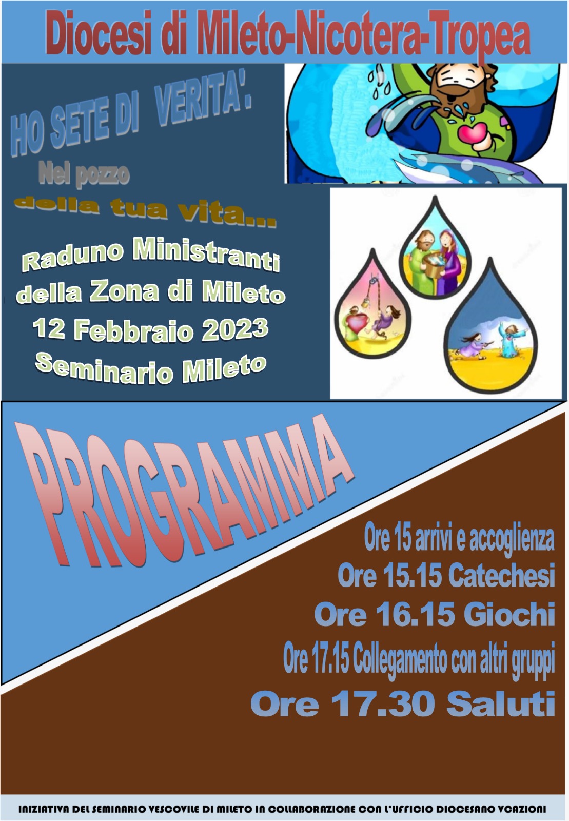 Eventi in Diocesi 9 Febbraio 2023 Raduno zonale dei ministranti – Zona Mileto domenica 12 Febbraio Descrizione: Inizio: 12/02/2023 15:00 Fine: 12/02/2023 17:30 Categorie: Eventi in Diocesi Organizzatore: Ufficio per la pastorale delle vocazioni Regione: Calabria Paese: Italia radunoministranti12feb23
